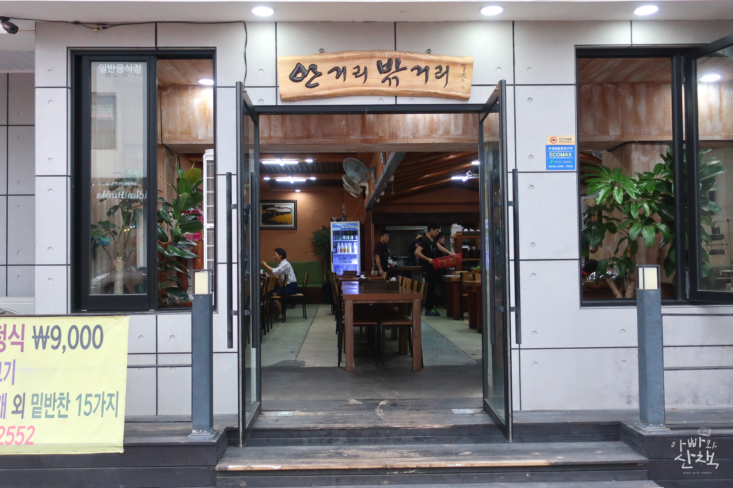 안거리밖거리는 옥돔구이, 돔베고기와 함께 10여 가지 반찬이 나오는 백반집으로 적당한 가격에 푸짐한 한 상을 맛볼 수 있어 도민들이 즐겨 찾는 '도민맛집'입니다. 맛있는 먹거리가 넘치는 제주도지만 여행을 하다 보면 비싼 맛집에 지쳤을 때, 편안한 집밥이 생각날 때가 있게 마련인데, 그럴 때면 더없이 반가운 곳이 바로 안거리밖거리입니다. 콩나물, 김치, 고사리나물 등 평범한 집밥 반찬도 있지만 잡채, 달걀찜 등 아이들도 좋아할 구성입니다. 특히 이 정도의 가격에 제주에서도 비싸기로 소문난 옥돔구이와 돔베고기(돼지 수육)까지 먹을 수 있으니 여행 중 특별한 한 끼로도 손색이 없습니다. 저렴한 가격이므로 6세 이상 1인 1 메뉴 주문은 필수입니다. 돔베고기, 옥돔구이 등은 추가 주문도 가능한데, 정식 가격에 비해서는 비싸게 느껴질지 모르지만, 일반 음식점보다는 여전히 저렴합니다.