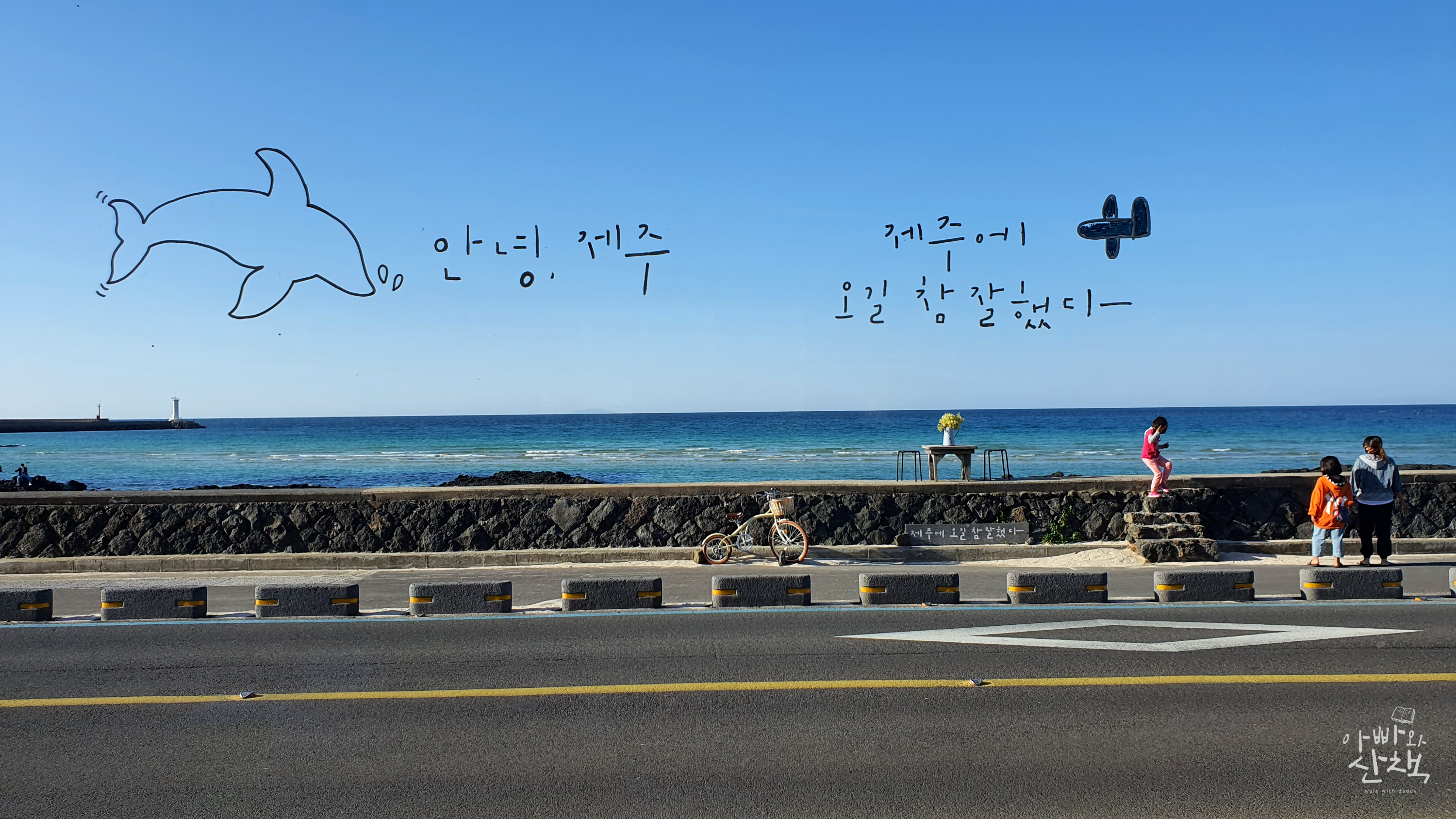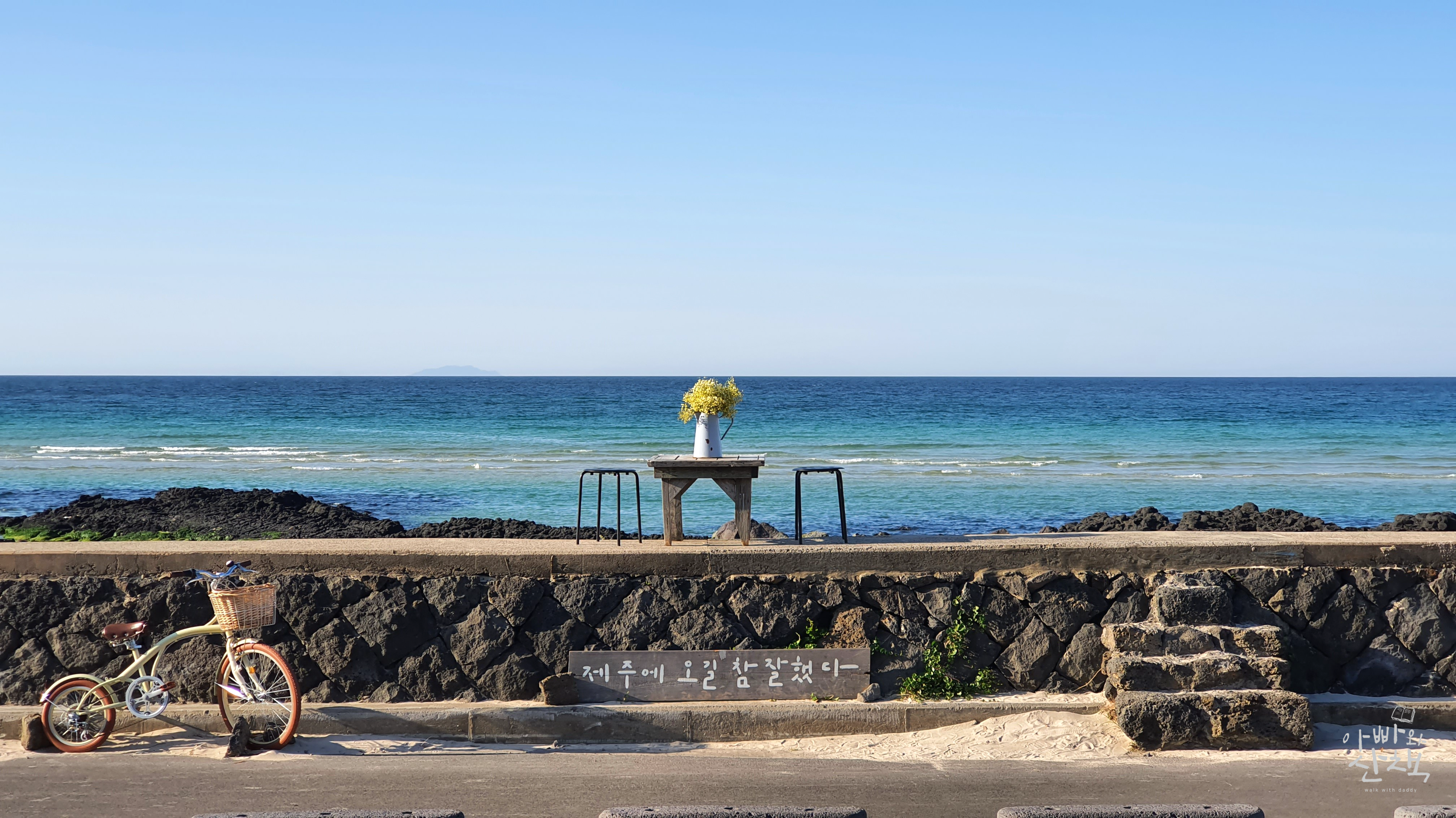 카페 앞 방파제 위에 올려둔 의자와 테이블 그리고  화병 속 꽃은 이곳의 상징이자 세화해변을 대표하는 포토존이라고 해도 과언이 아닐 것 같습니다. 낭만적인 제주의 풍경을 예쁜 엽서 속 그림처럼 표현하고 있는 이곳에는 SNS에 올릴 사진을 찍는 젊은 여행자들로 언제나 북적입니다.
