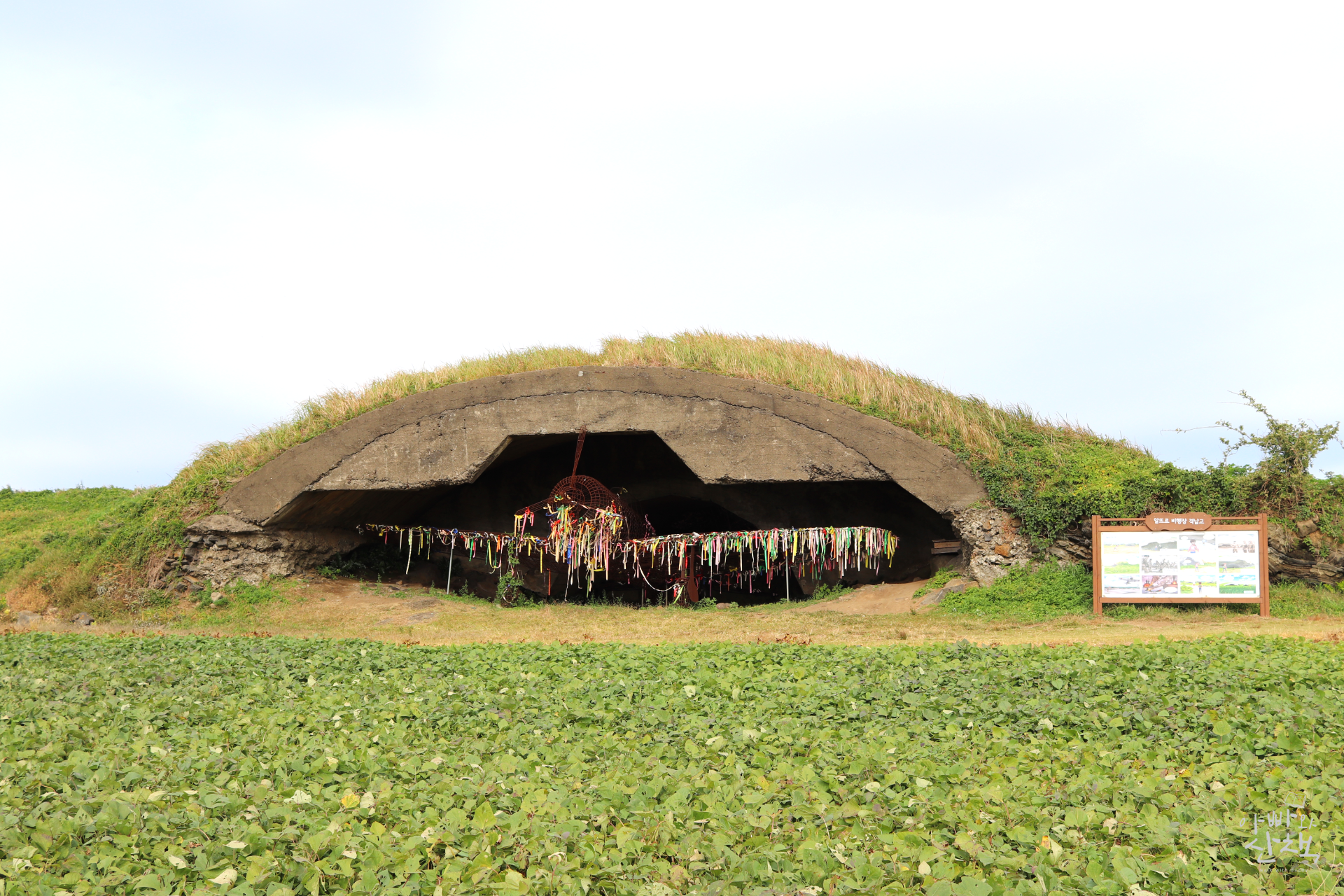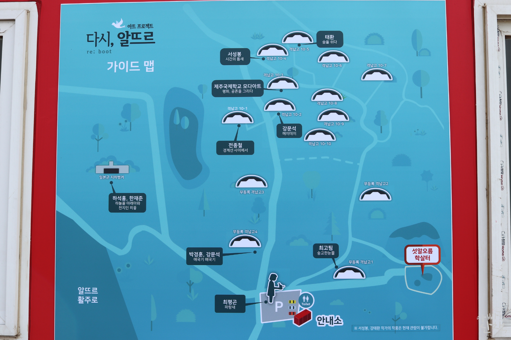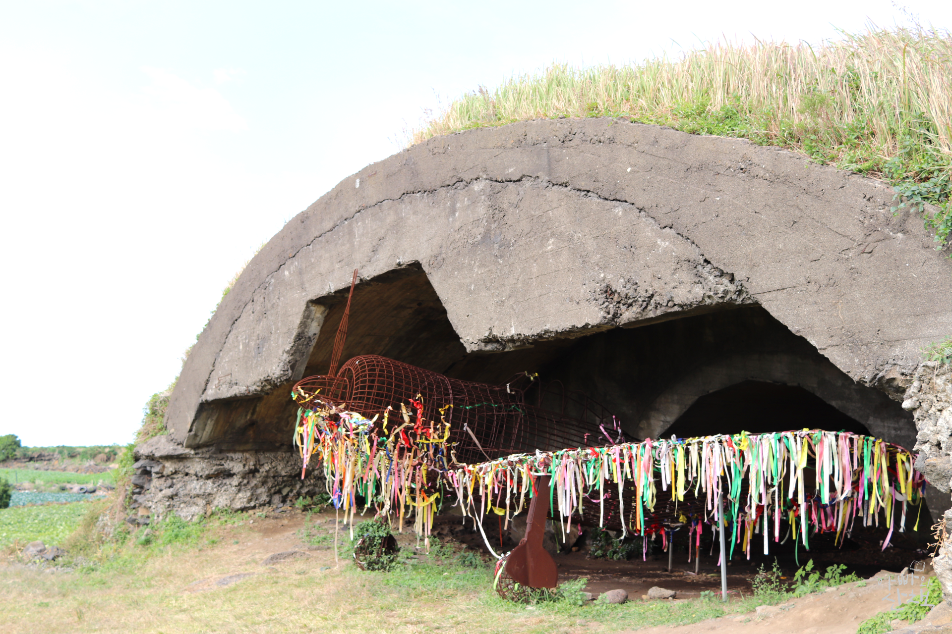 '알뜨르'는 제주어로 아래쪽 들판이라는 뜻으로, 알뜨르비행장은 송악산 아래 벌판에 만들어진 일제강점기 시절 비행장입니다. 일본 본토에서 날아온 비행기가 중국 침략을 위해 머물던 곳으로 제2차 세계 대전 시에는 가미카제 조종사들의 훈련장이기도 했습니다. 현재 알뜨르비행장에는 남아있는 19기의 콘크리트 격납고와 비엔날레 행사 때 만들어진 조형물들이 일제강점기라는 아픈 역사를 되새겨보게 합니다.