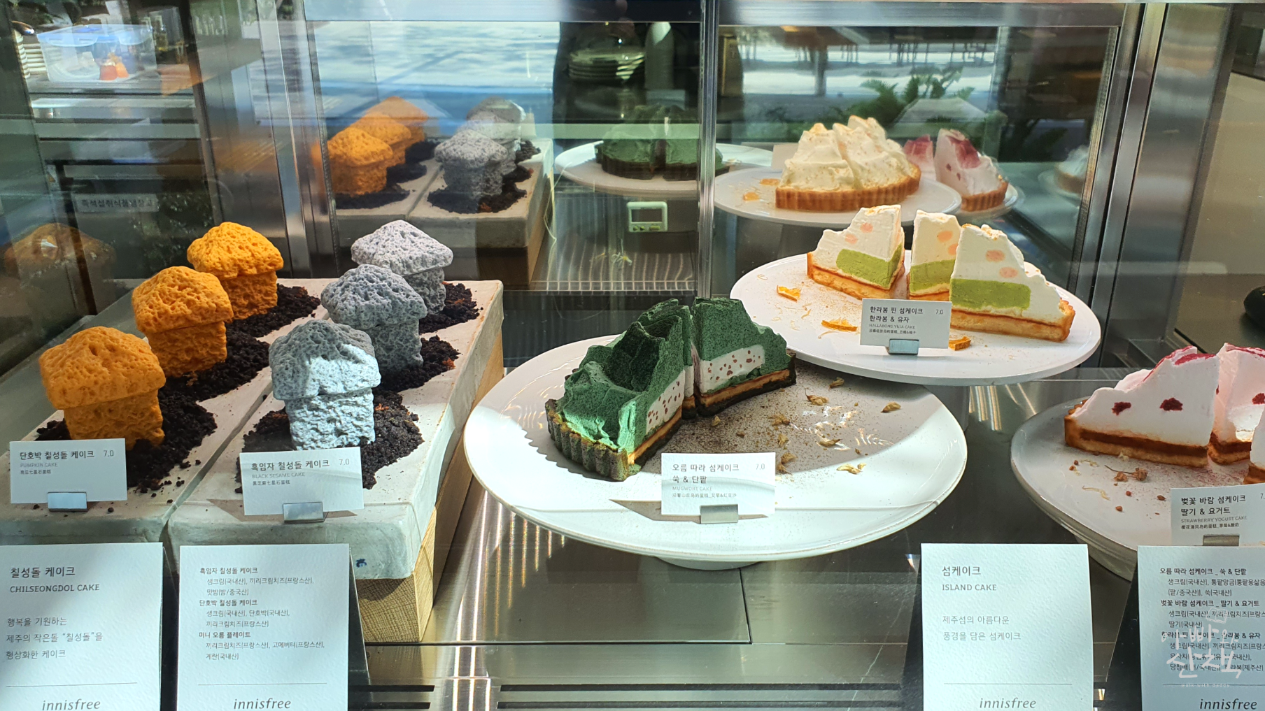 - 카페 메뉴: 아메리카노 5,800원, 애월 바다 레몬 에이드 7,500원, 오름 따라 섬케이크 쑥&단팥 10,000원, 흑임자 칠성돌 케이크 12,000원, 한라산케이크 15,000원, 해녀 바구니 브런치 20,000원, 감귤 아이스크림 5,000원,