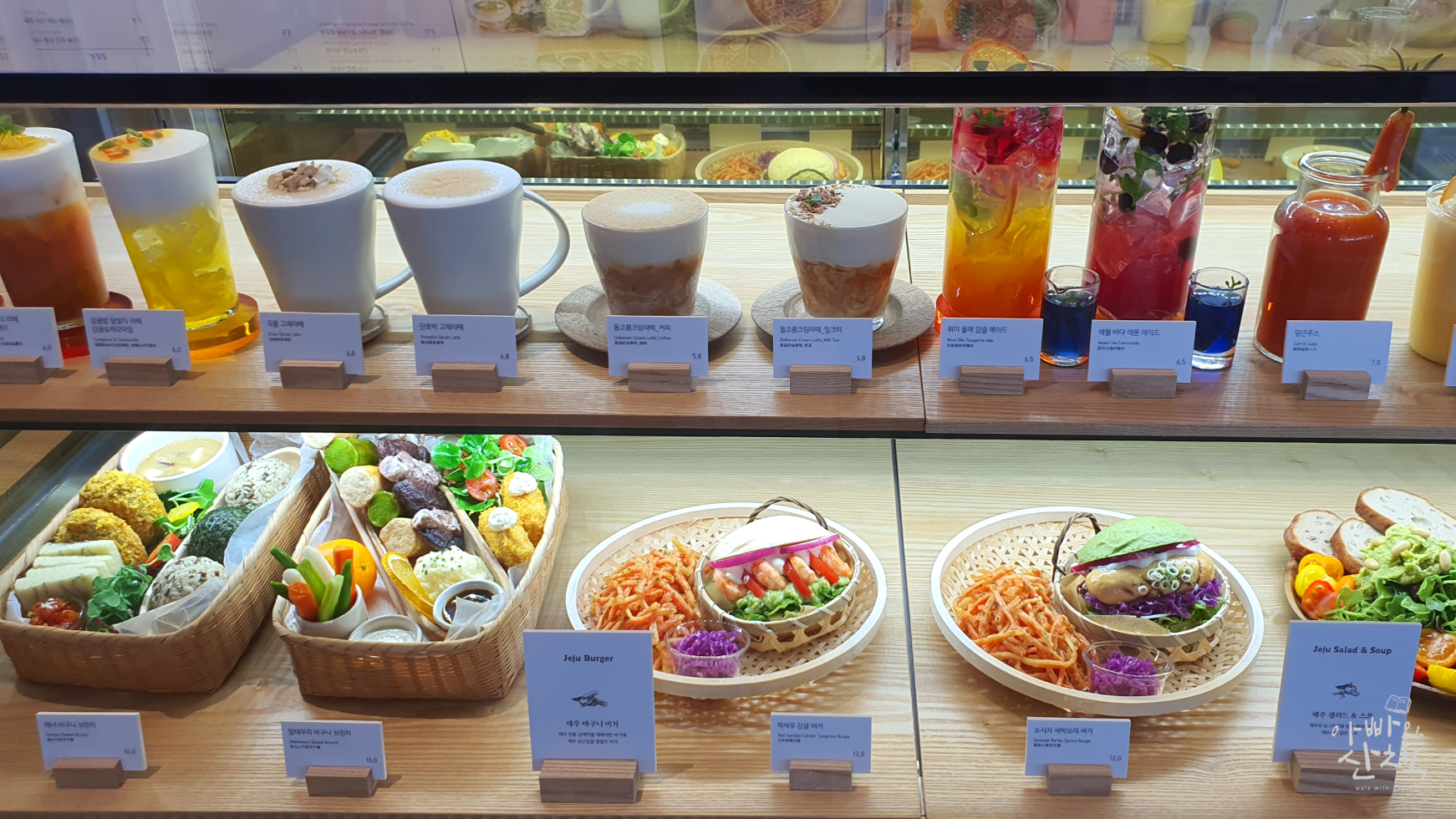- 카페 메뉴: 아메리카노 5,800원, 애월 바다 레몬 에이드 7,500원, 오름 따라 섬케이크 쑥&단팥 10,000원, 흑임자 칠성돌 케이크 12,000원, 한라산케이크 15,000원, 해녀 바구니 브런치 20,000원, 감귤 아이스크림 5,000원,