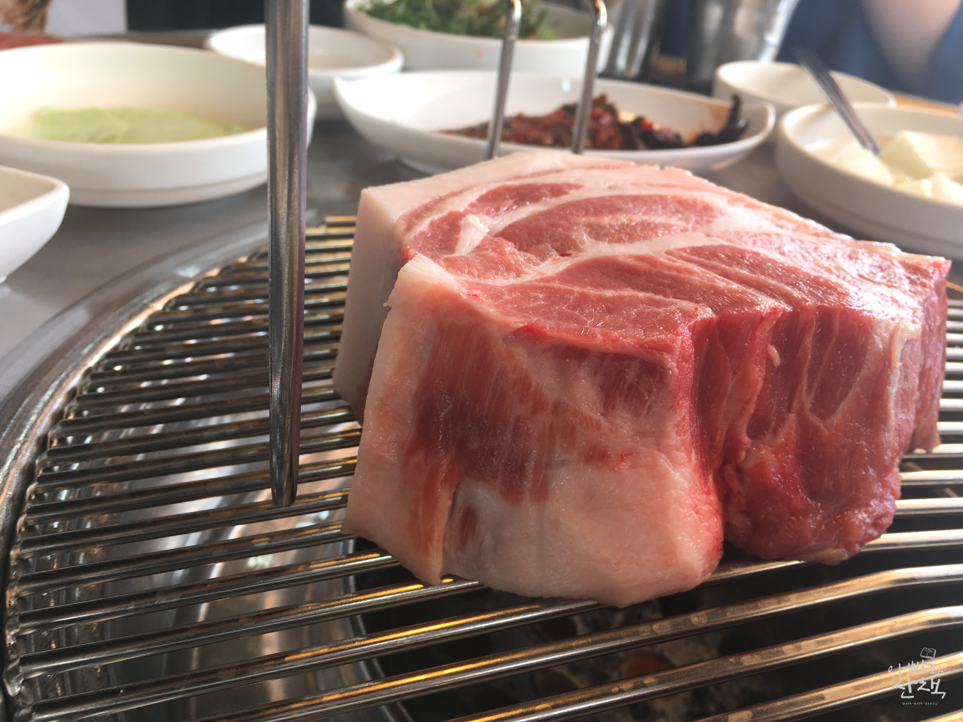 연탄불이 들어가는 원형 깡통 테이블과 동그란 의자가 가득한 실내는 흔한 삼겹살 가게의 모습이지만 제주의 명물이 된 두툼한 근고기의 원조 격인 흑돼지 전문점입니다. <1박 2일>, <수요미식회> 등 TV프로그램에 소개되기도 했던 곳으로 직원이 구워주는 두툼한 고기를 멜젓에 찍어 먹는 맛이 일품이어서 방송 전부터도 도민들이 즐겨 찾던 곳으로 방송 후 더욱 많은 사람들이 찾아와 대기해야 하는 경우가 잦습니다.
