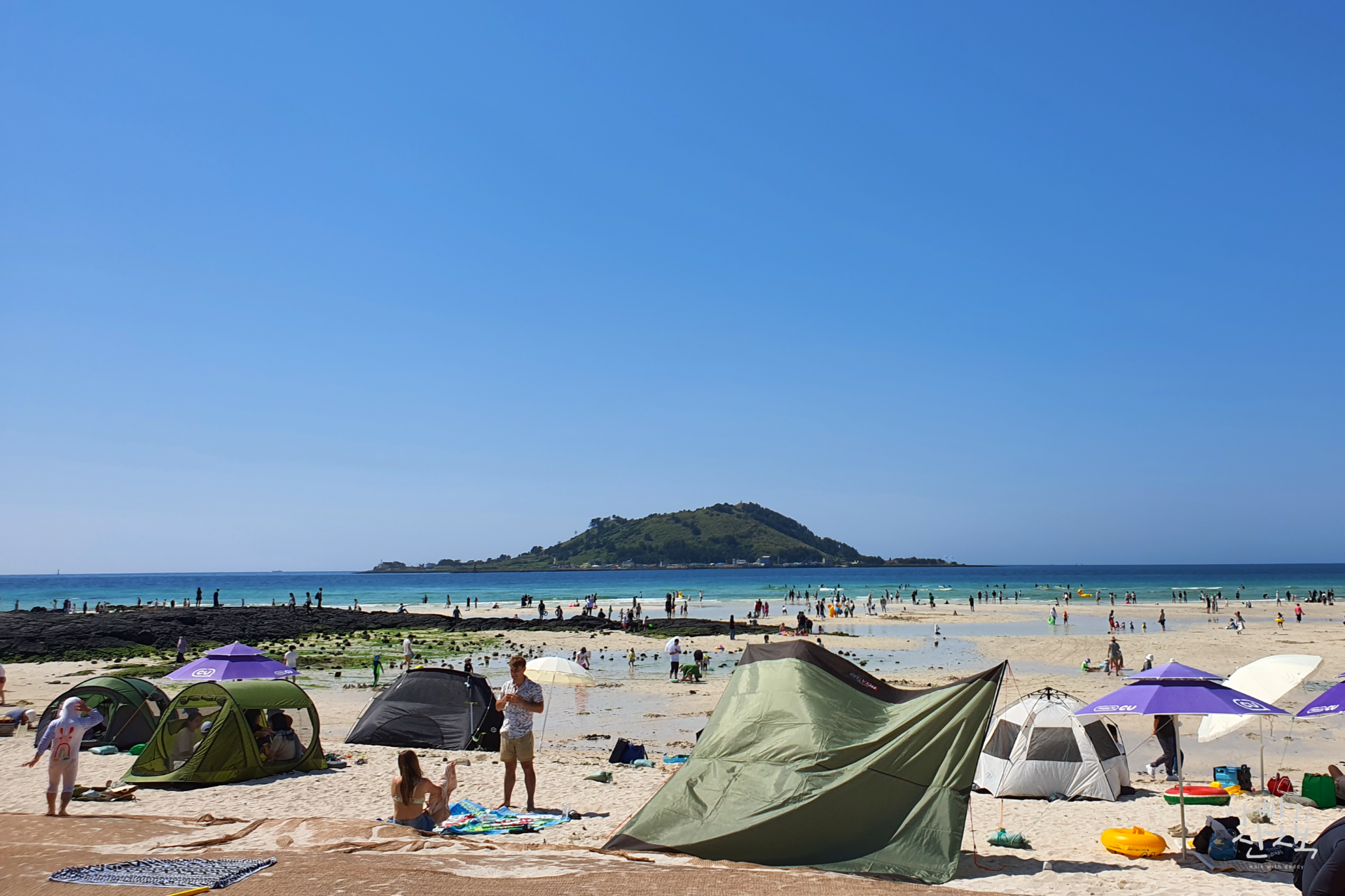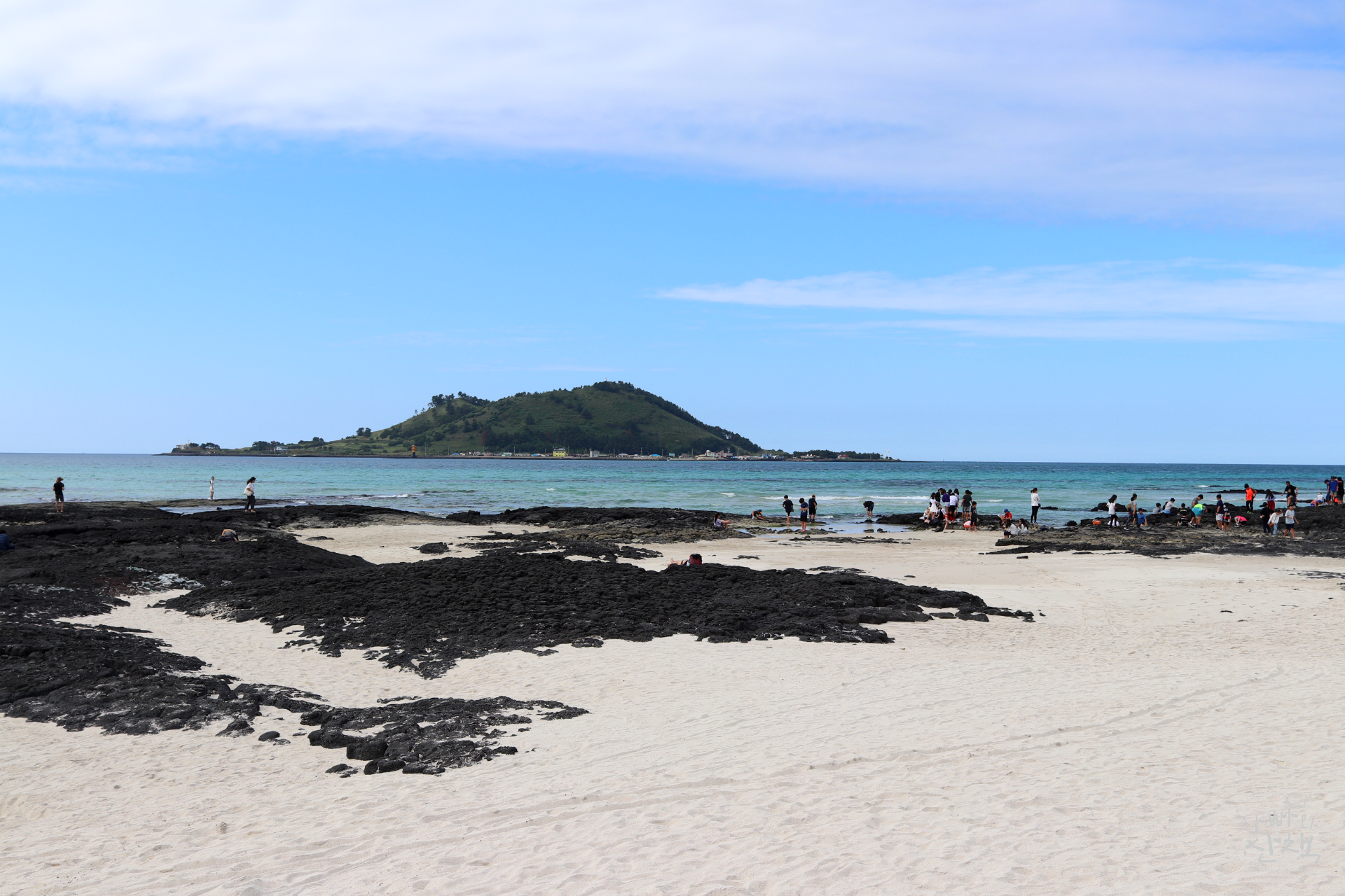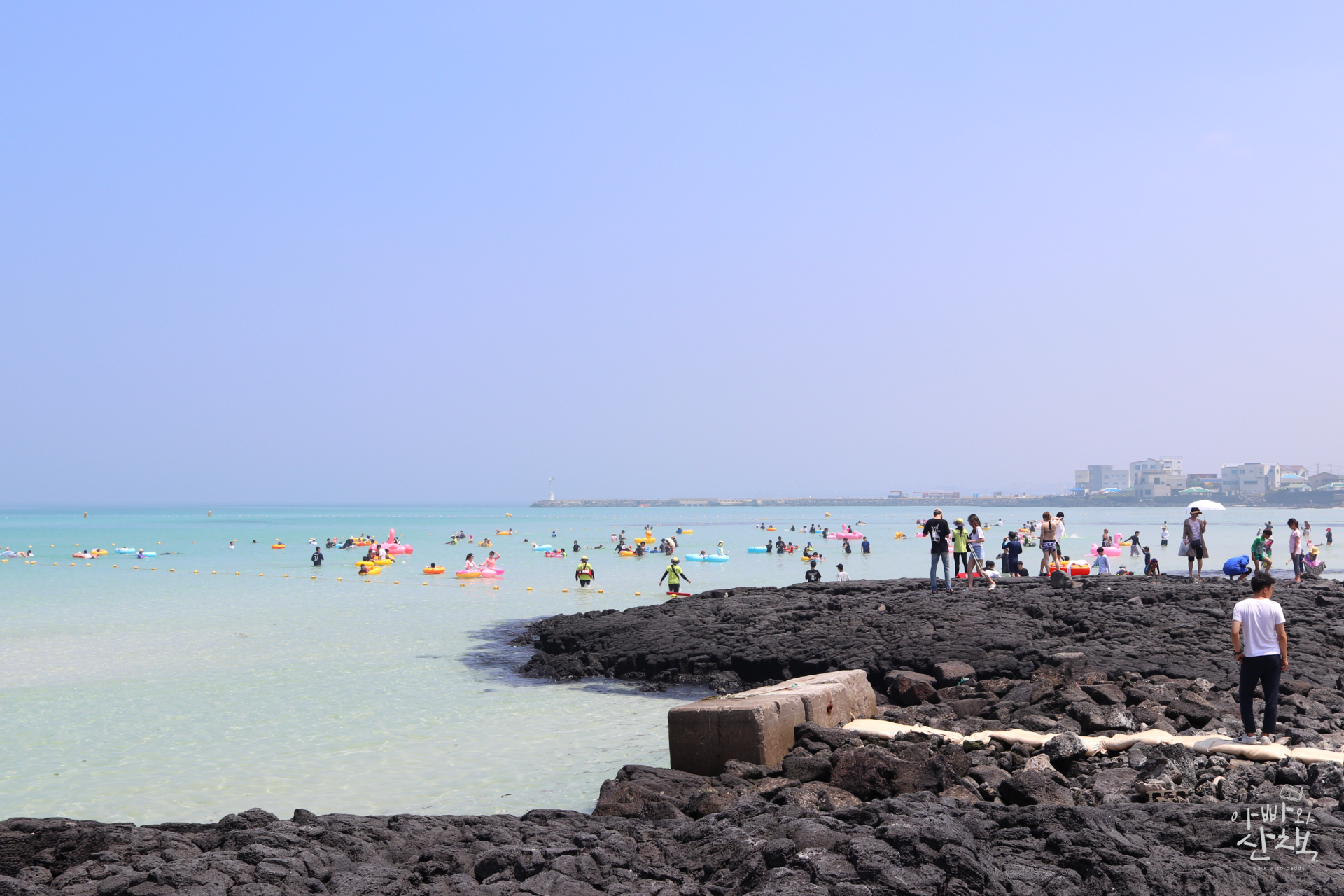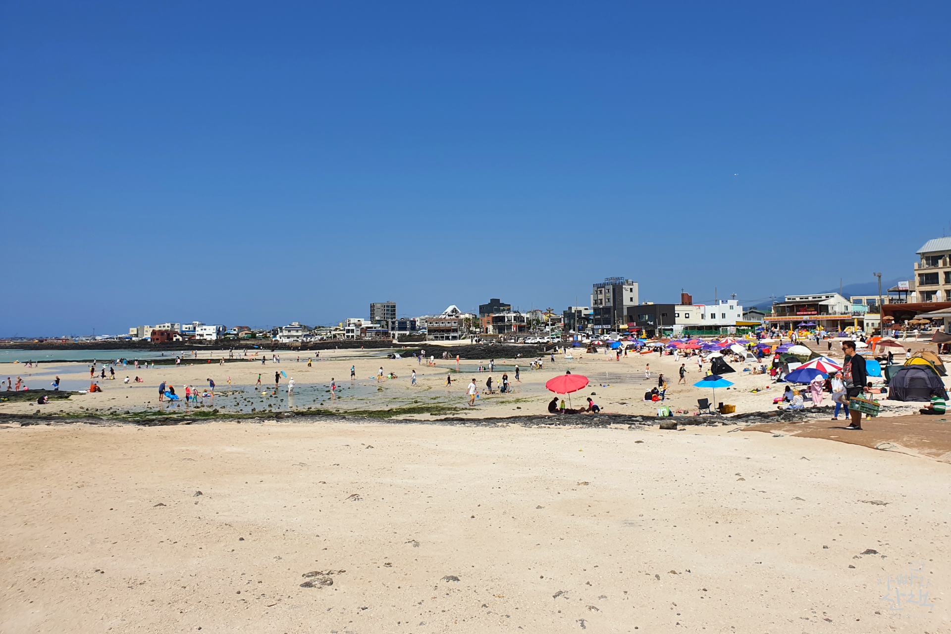 에메랄드빛 바다와 얕은 수심으로 인기가 많은 제주의 대표 해수욕장