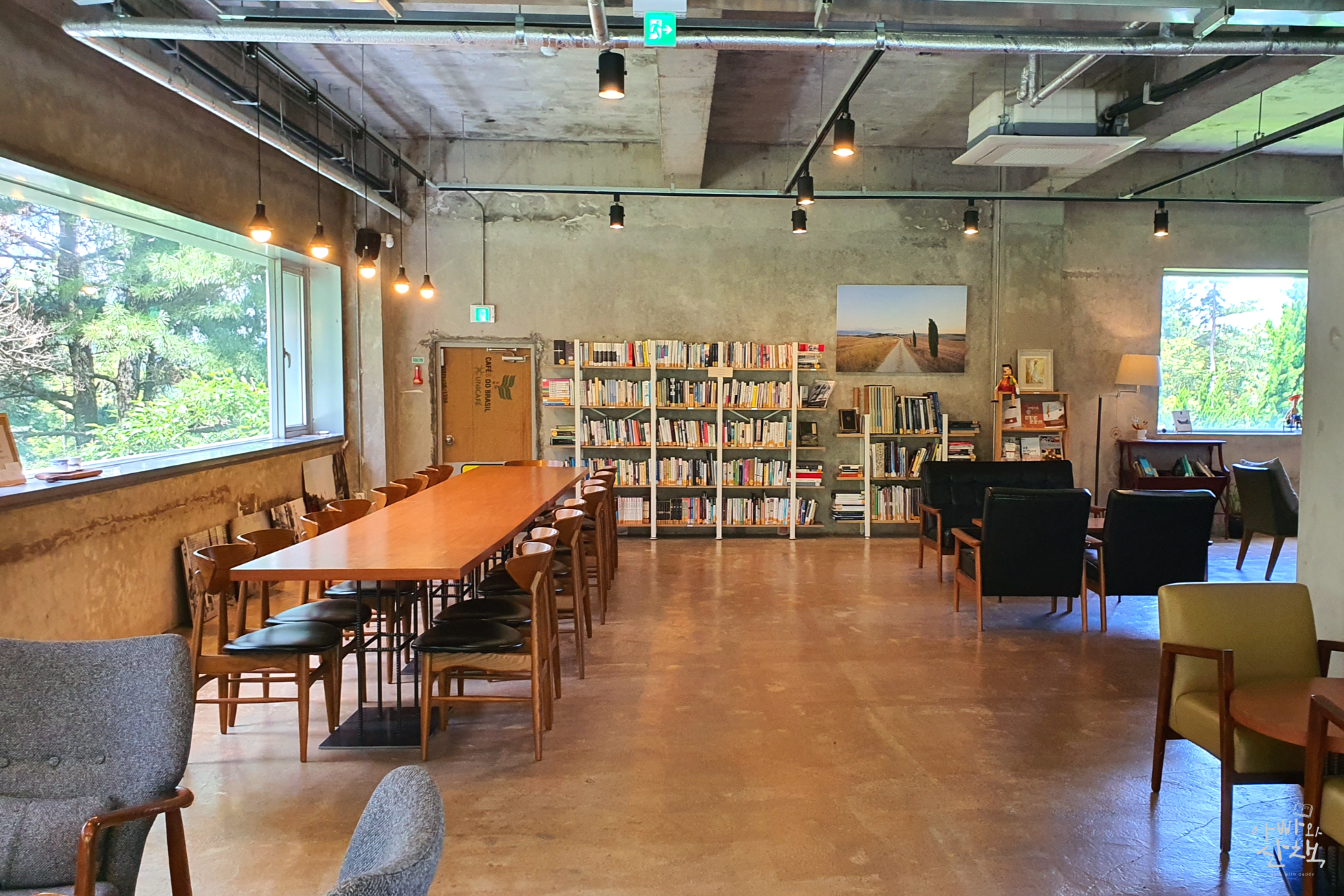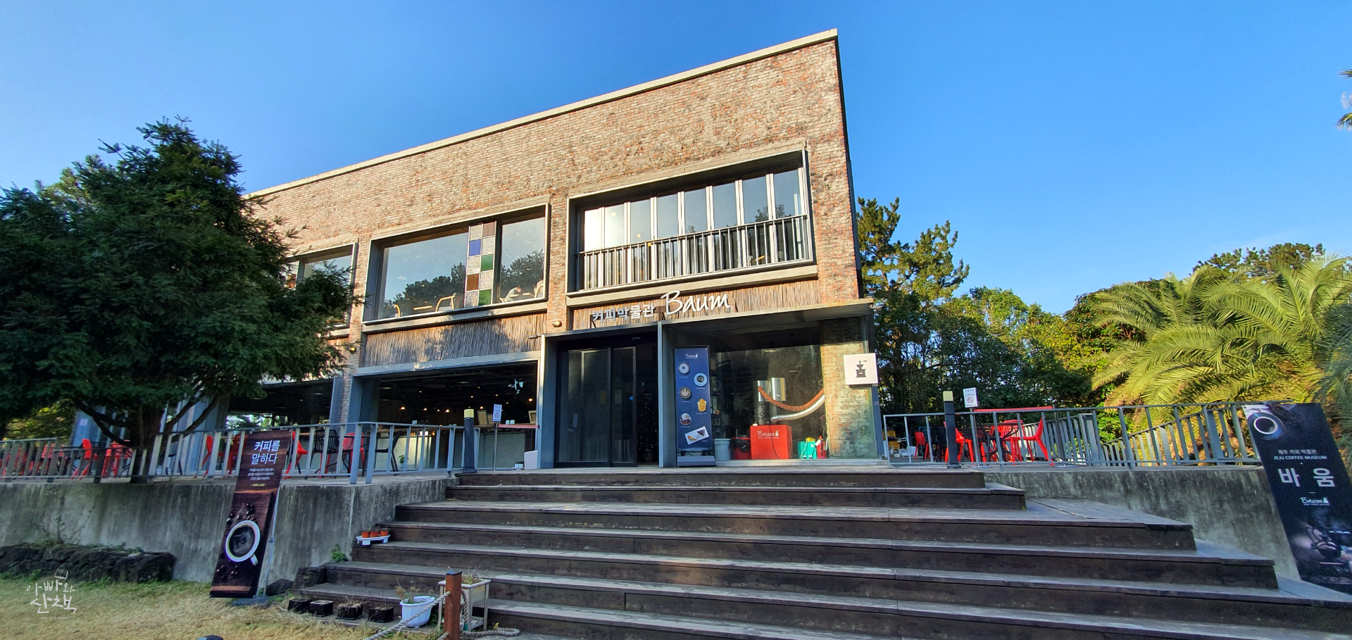 나무가 가득한 산길을 따라 제법 올라가면 빛의 벙커와 함께 사용하는 넓은 주차장이 나타나고 빛의 벙커로 가는 길을 따라가다 보면 2층으로 된 카페를 발견하게 되는데 바로 제주커피박물관 바움 Baum입니다. 그냥 카페가 아니라 박물관이라는 상호를 쓰는 이유는 1층은 커피 그라인더, 명품 브랜드 찻잔 등 커피와 관련된 소품을 전시하고 있는 박물관으로 운영되며 2층은 카페로 운영 중이기 때문입니다. 2층의 카페 공간은 정원 풍경을 즐기며 쉴 수 있는 테라스와 다양한 형태의 테이블이 있는 넓은 실내로 구성되어 있어서 취향에 따라 여유로운 시간을 즐길 수 있습니다. 카페 정원 안에 있는 폐벙커에서 미디어아트 ‘빛의 벙커’가 진행 중이므로 함께 둘러보시길 추천합니다.