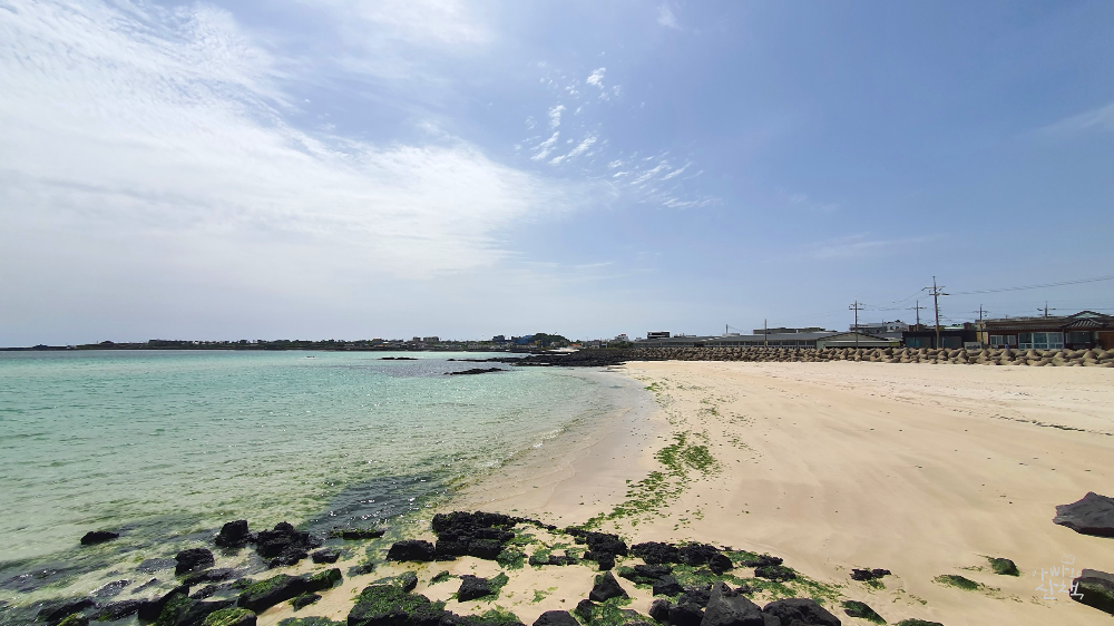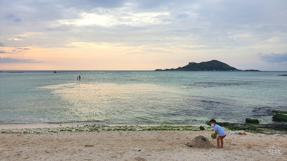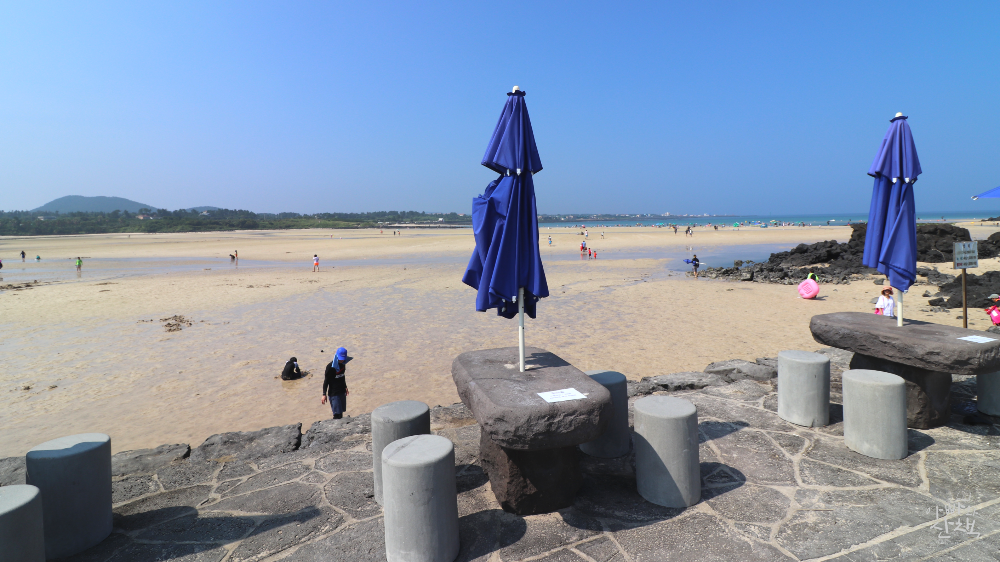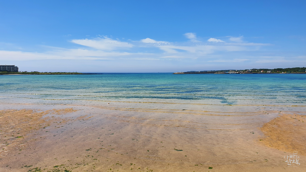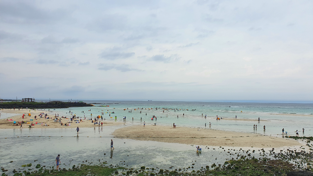 수심이 얕은 편으로 에머랄드빛 바다색이 이국적인 풍경은 연출합니다. 제주에서 가장 인기가 많아 사람들이 많이 찾는 곳인 만큼 편의시설도 잘 갖춰져 있고, 주변에 숙박 시설이 많아 음식점, 카페 등이 많습니다.