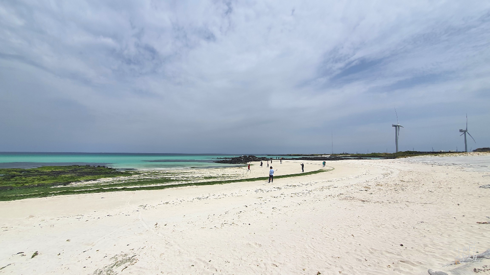 조개껍질 가루로 이루어진 부드러운 모래사장이 특징입니다. 바닷물이 빠지는 썰물 때에는 매우 넓은 백사장이 펼쳐지는 탓에 바닷물까지 제법 걸어 나가야 할 정도입니다. 제주의 동남쪽에서는 가장 규모의 해변이지만 크기에 비해서는 방문객이 적은 편입니다.