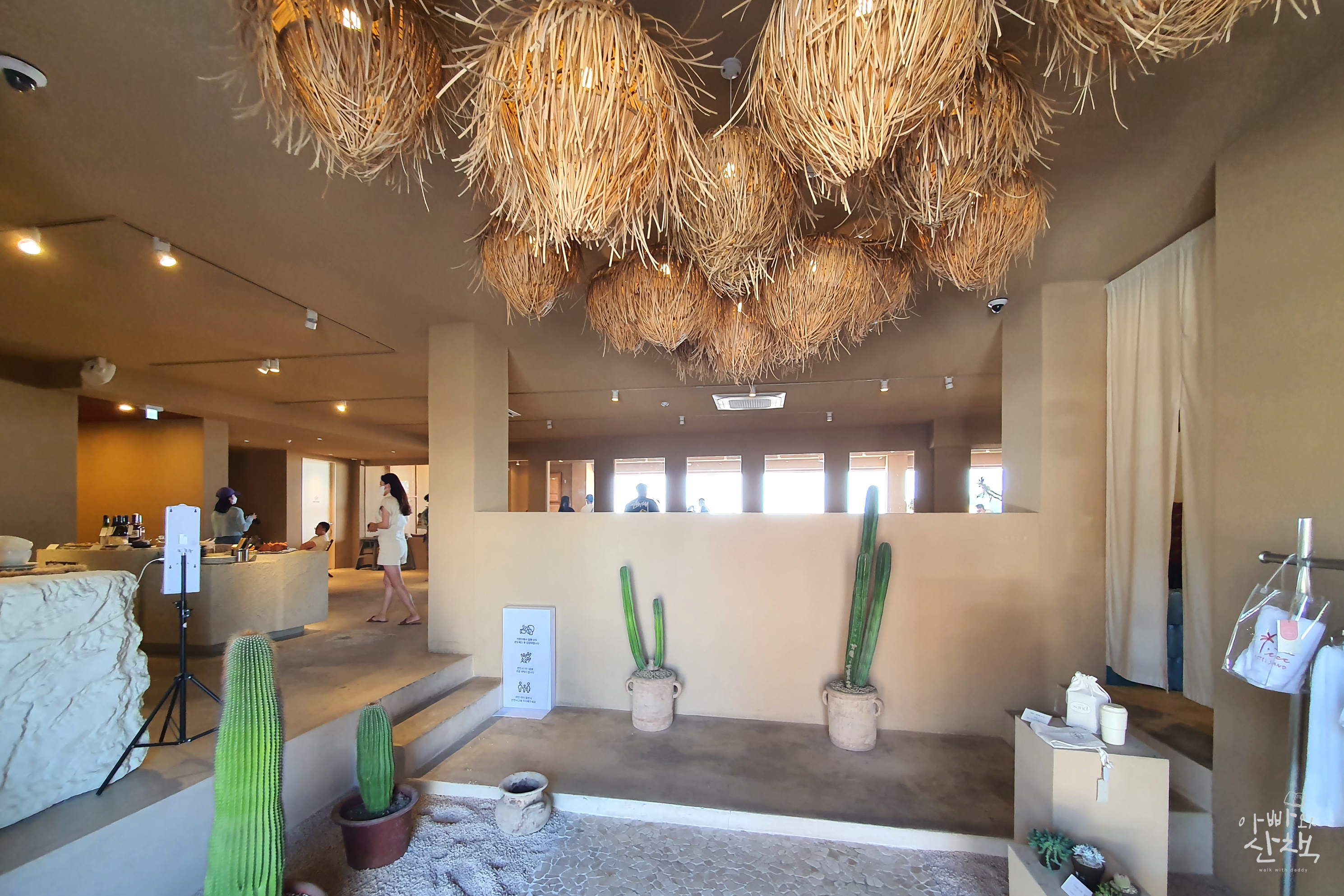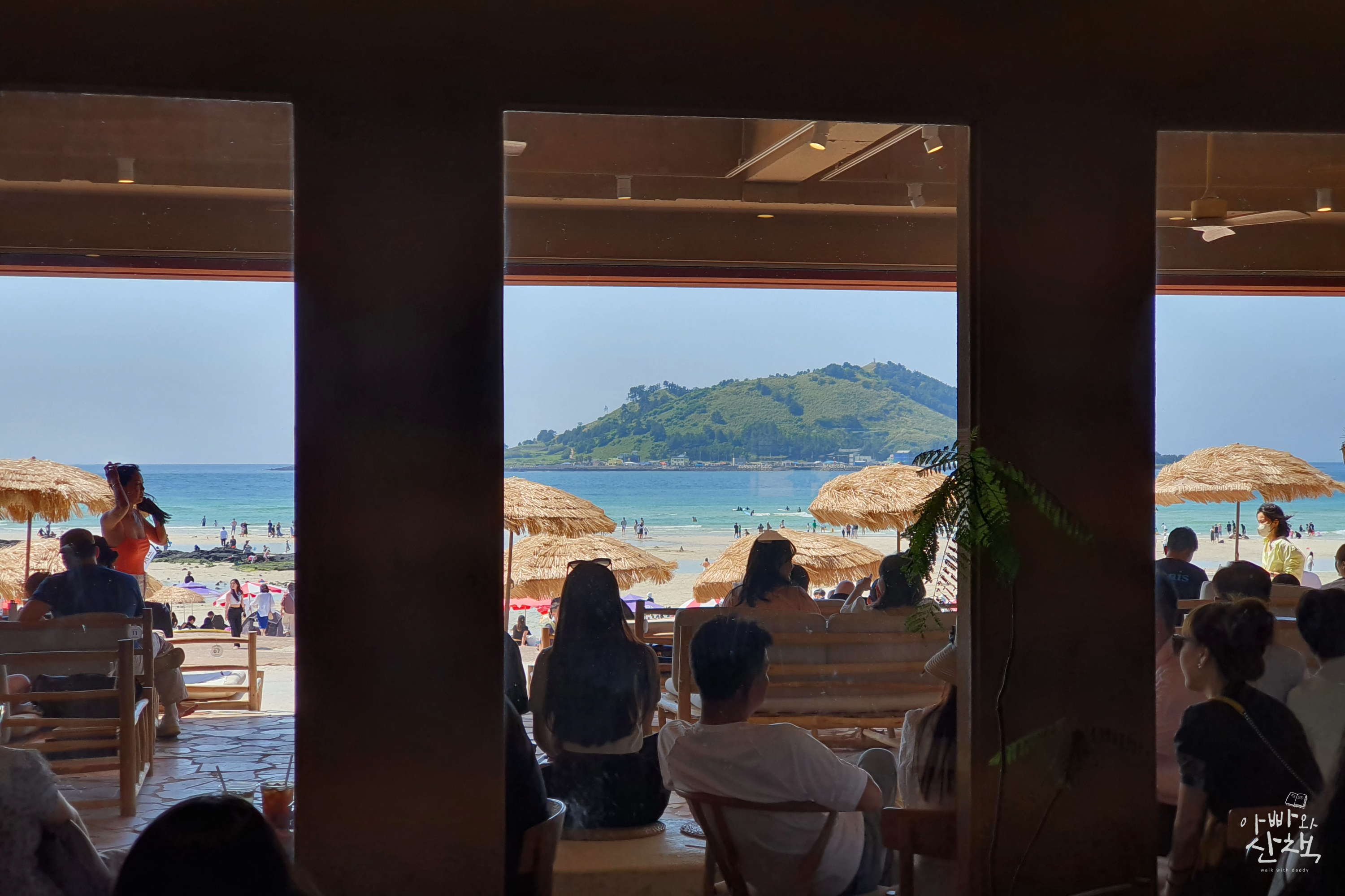 도로변의 평범한 입구를 들어서면 비양도와 협재 바다가 한눈에 들어오는 멋진 전망의 실내가 펼쳐집니다. 협재해수욕장의 모래사장으로 이어진 출입구 옆에는 밀짚 파라솔이 배치되어 있어 동남아 휴양지에 온 듯한 이국적인 분위기가 가득한 색다른 느낌의 카페입니다.