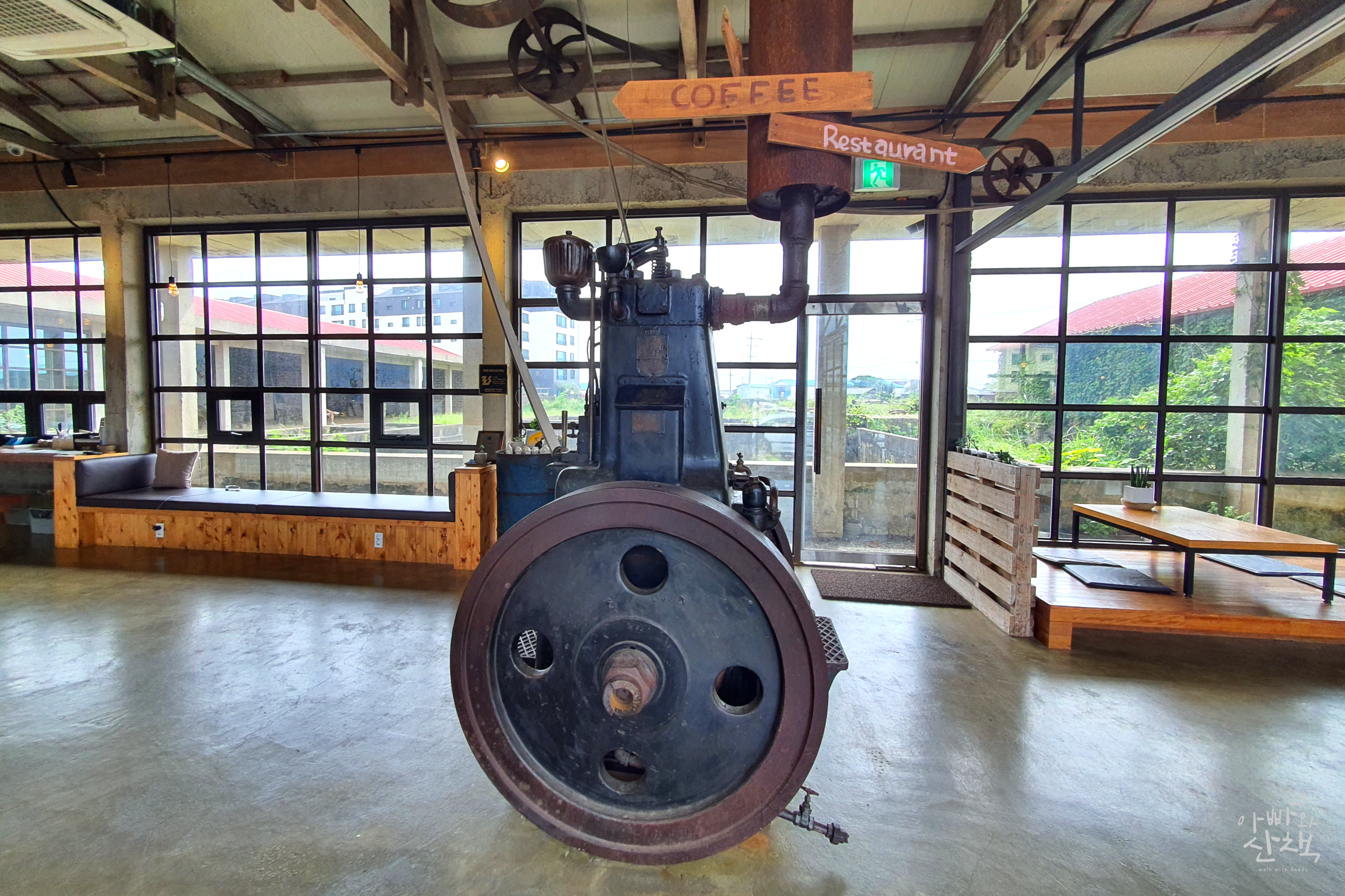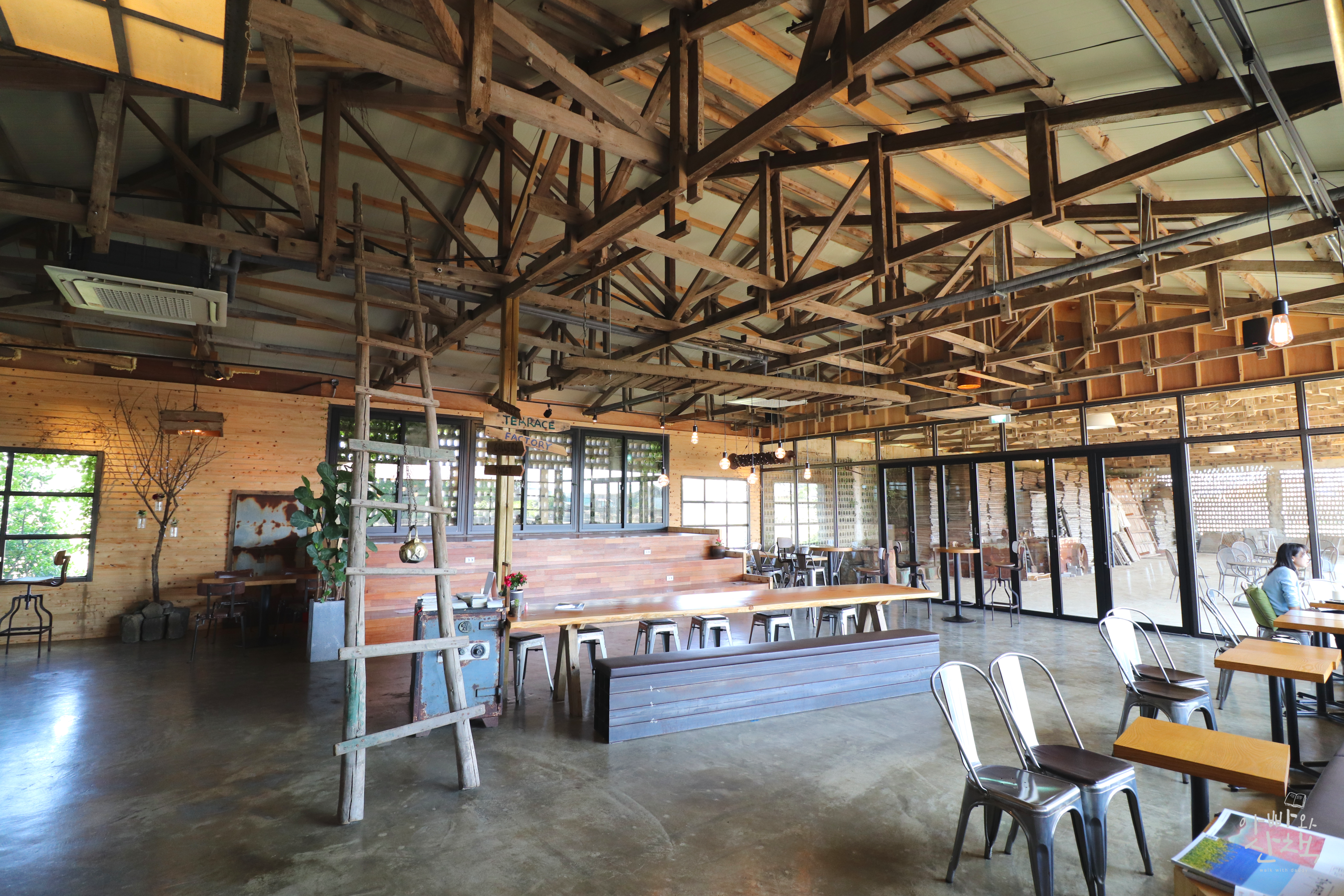 카페로 사용하는 건물 내에는 널찍한 공간이 주는 여유로움과 함께 당시의 기계와 장비들을 장식해 이색적인 분위기를 느낄 수 있습니다. 카페 건물 밖에는 고구마 저장고와 그 시절 기계들이 고스란히 남아 있는 창고가 있고, 다양한 전시가 이어지고 있는 갤러리가 함께 운영되고 있습니다.