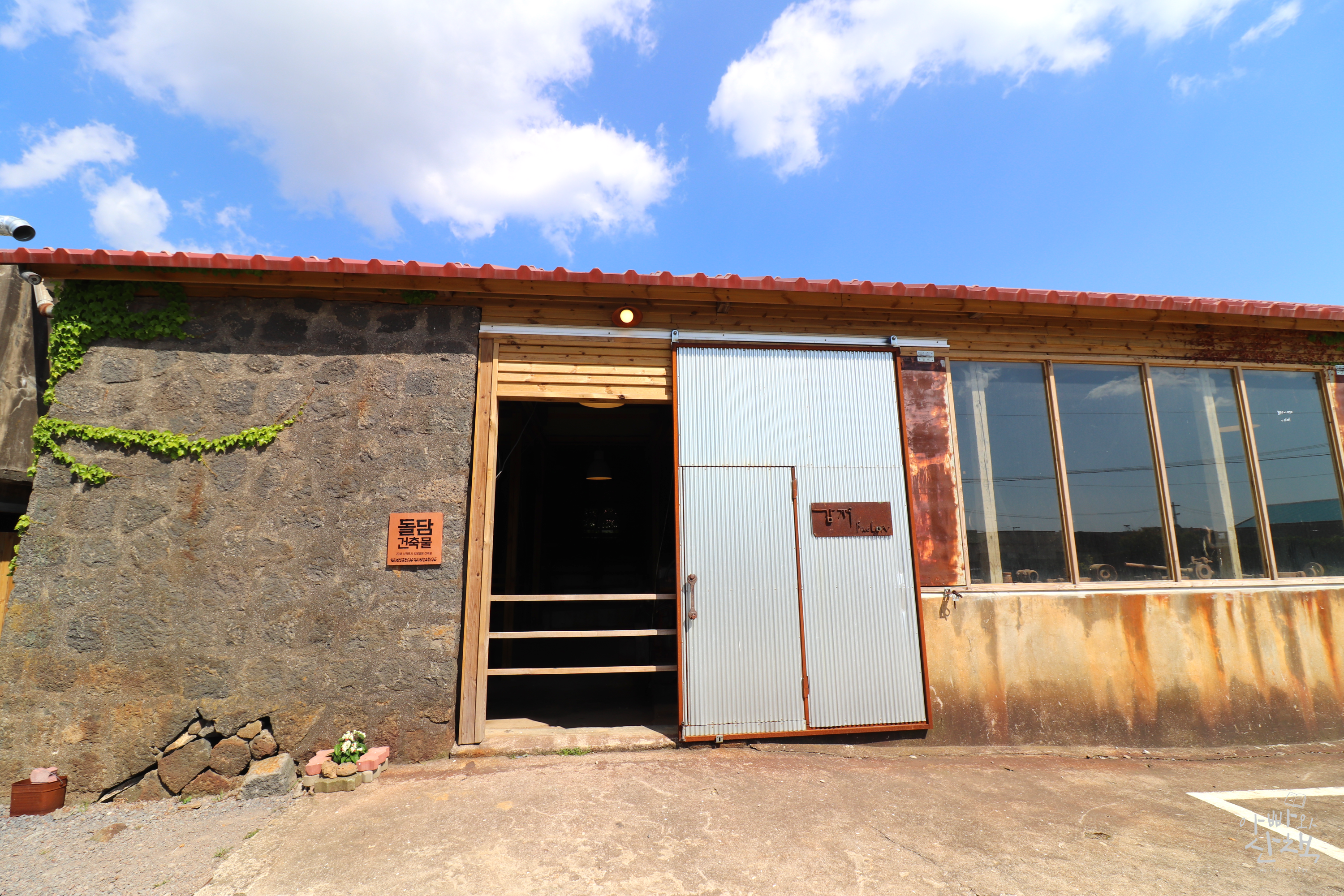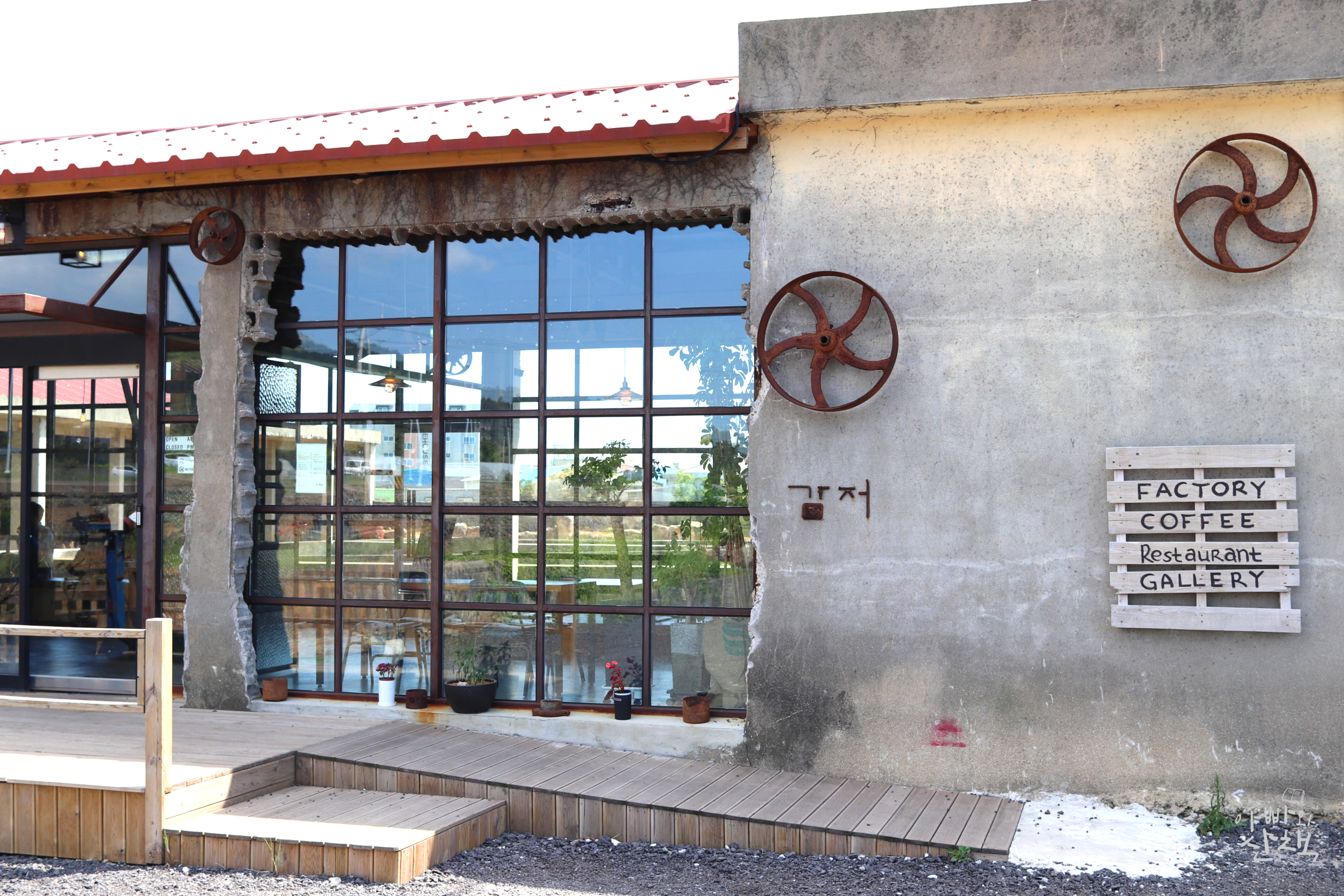 대정읍의 '감저'는 1964년 건축되어 1987년까지 활발하게 가동되었던 고구마 전분공장을 최소한의 리모델링만 하여 카페와 갤러리로 운영하는 복합문화공간입니다. 상호인 <감저>는 제주어로 고구마란 뜻으로 고구마 전분을 만들던 공장을 리모델링한 공간이기에 붙인 이름이라고 합니다.