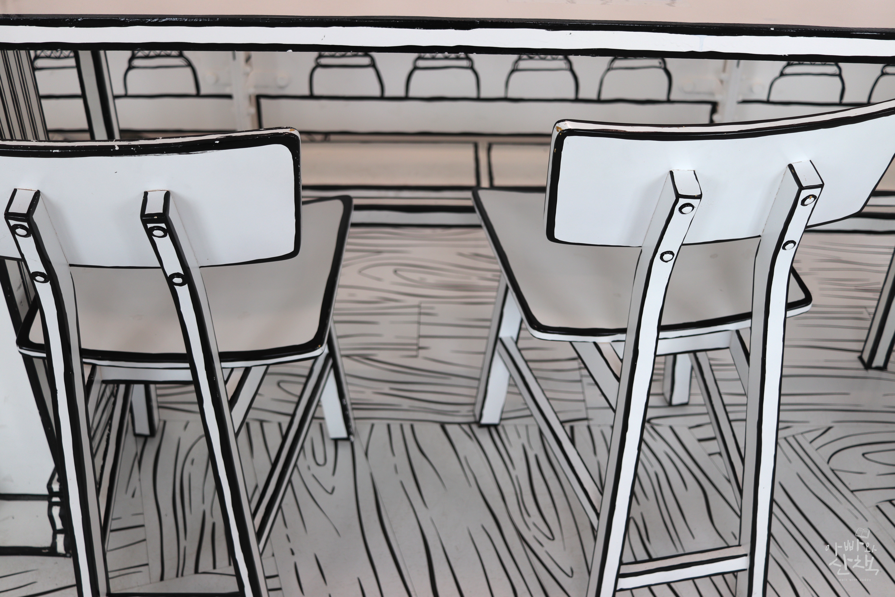 항공우주박물관 4층에 위치한 테마 카페로 순백색의 실내에 다섯 명의 화가가 검은색 라인으로 그린 그림 인테리어가 이색적인 곳입니다. 카페로 들어서면 흑백 만화 속으로 걸어 들어가는 듯한 색다른 경험과 함께 신기한 사진을 남길 수 있어 아이들도 휴대폰으로 직접 사진을 찍으며 즐거워합니다.