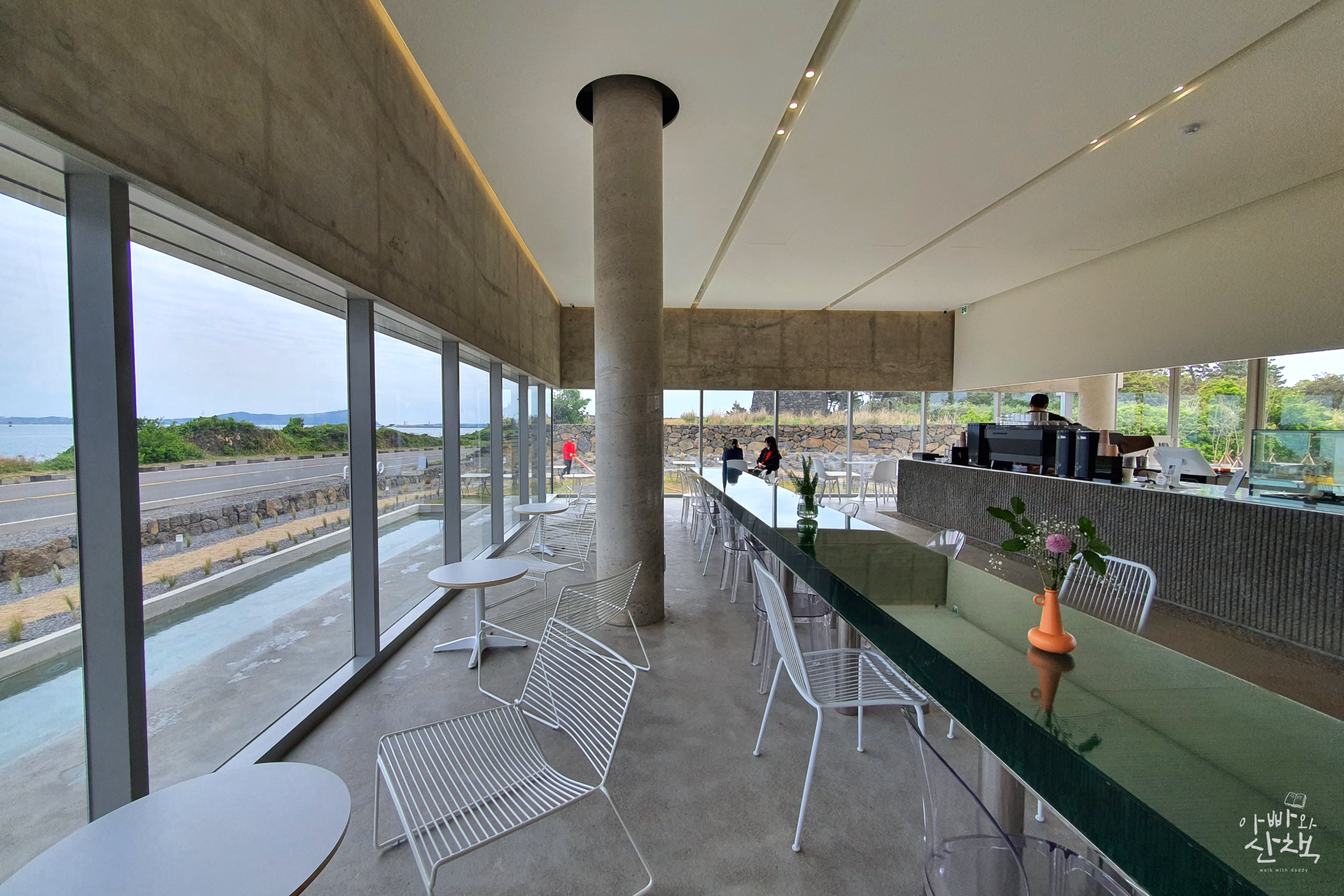 삼면이 유리로 되어 있는 1층의 바다 전망과 함께 루프탑에서는 우도, 성산 바다 그리고 지미봉의 모습이 시원스럽게 펼쳐져 제주 여행의 여유로움을 즐기기에 좋습니다. 멋진 전망만으로도 쉬어가기 좋은 곳이지만, 유리를 겹겹이 겹쳐 만든 3톤 무게의 긴 테이블과 루프탑에 있는 아코디언을 닮은 의자, 유럽 공원을 연상케 하는 철제 의자 등 특별한 가구와 인테리어를 둘러보는 재미도 놓치기 아쉬운 곳입니다. 특히 눈치 없이는 입구를 찾기 어려운 화장실 문이 주는 재미는 꼭 경험해 보시길 바라며, 차 한 잔의 여유와 함께 미술관 온 듯 둘러보는 시간을 가져보시길 추천합니다.