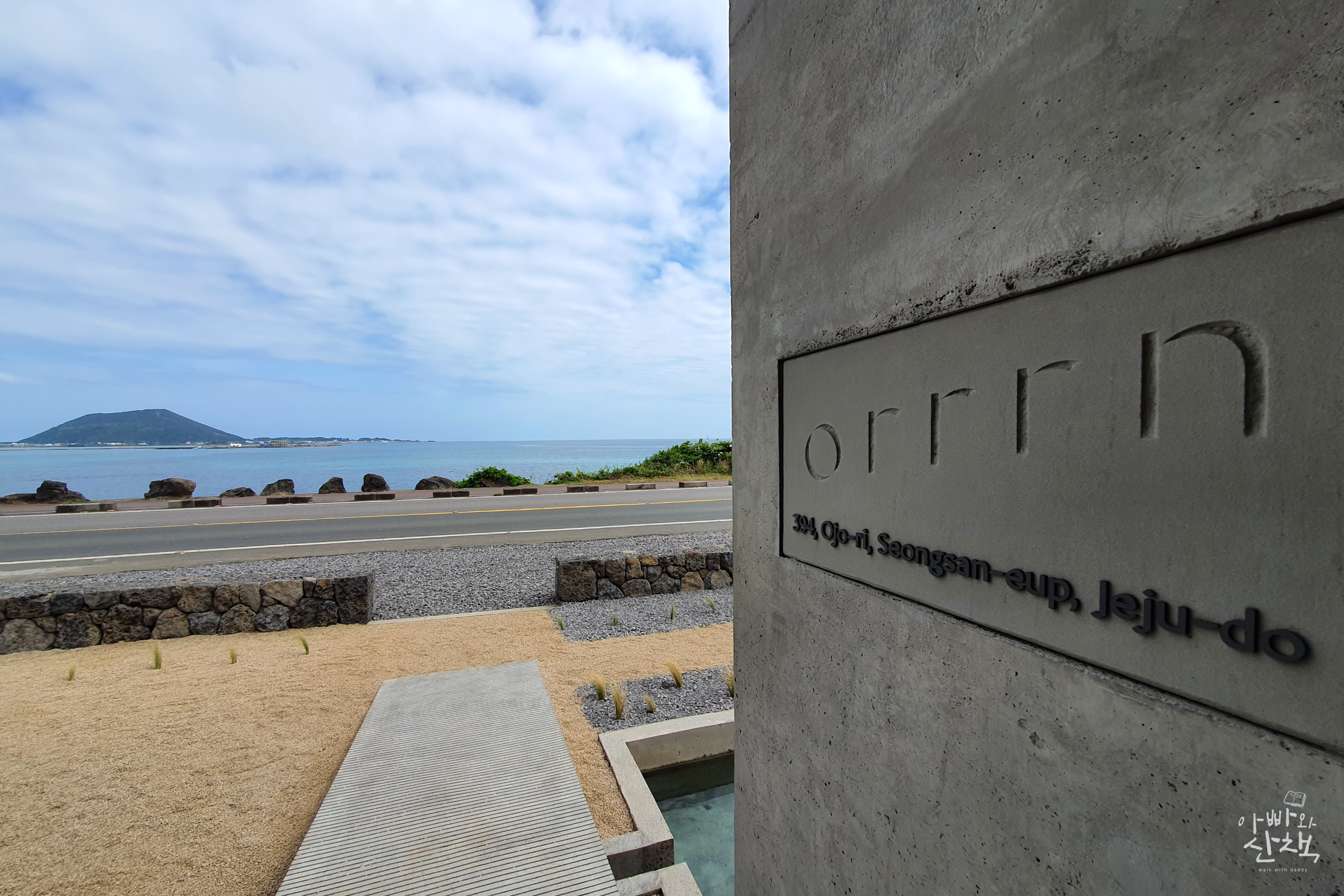 오른 orrrn은 올레길 1코스가 지나는 성산 오조리 해안도로에 위치한 베이커리 카페입니다. 노출 콘크리트의 건물 외관은 미술관이 아닐까 싶을 정도의 멋진 모습으로 시선을 사로잡고 내부 또한 다양한 분위기로 구성된 공간이 인상적인 곳입니다.