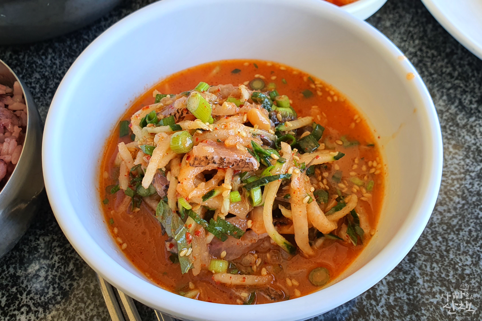 빙초산을 넣는 옛날 방식 물회입니다. 함께 나오는 제피는 산초와 비슷한데 비린내 등을 없애주는 향신료입니다.