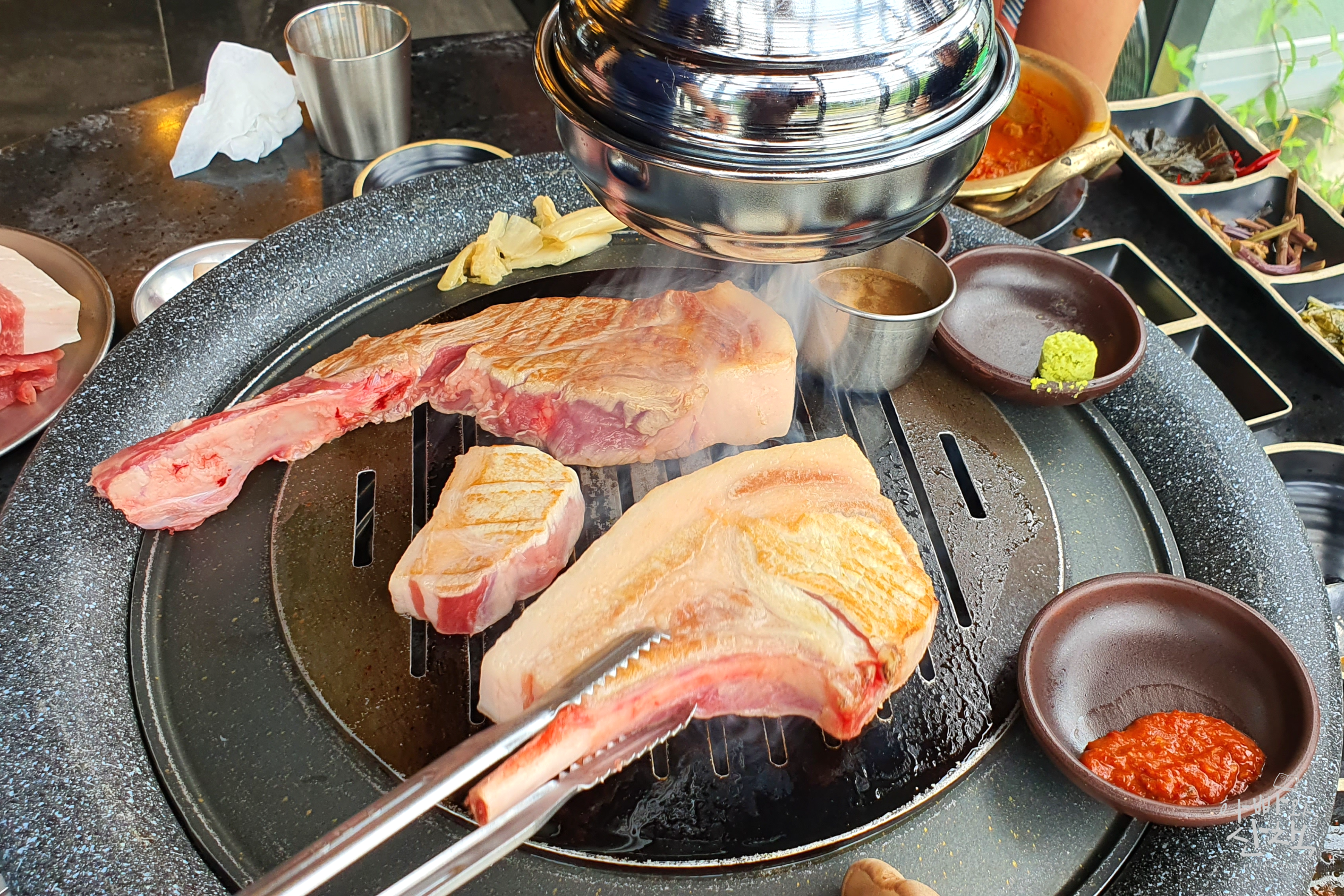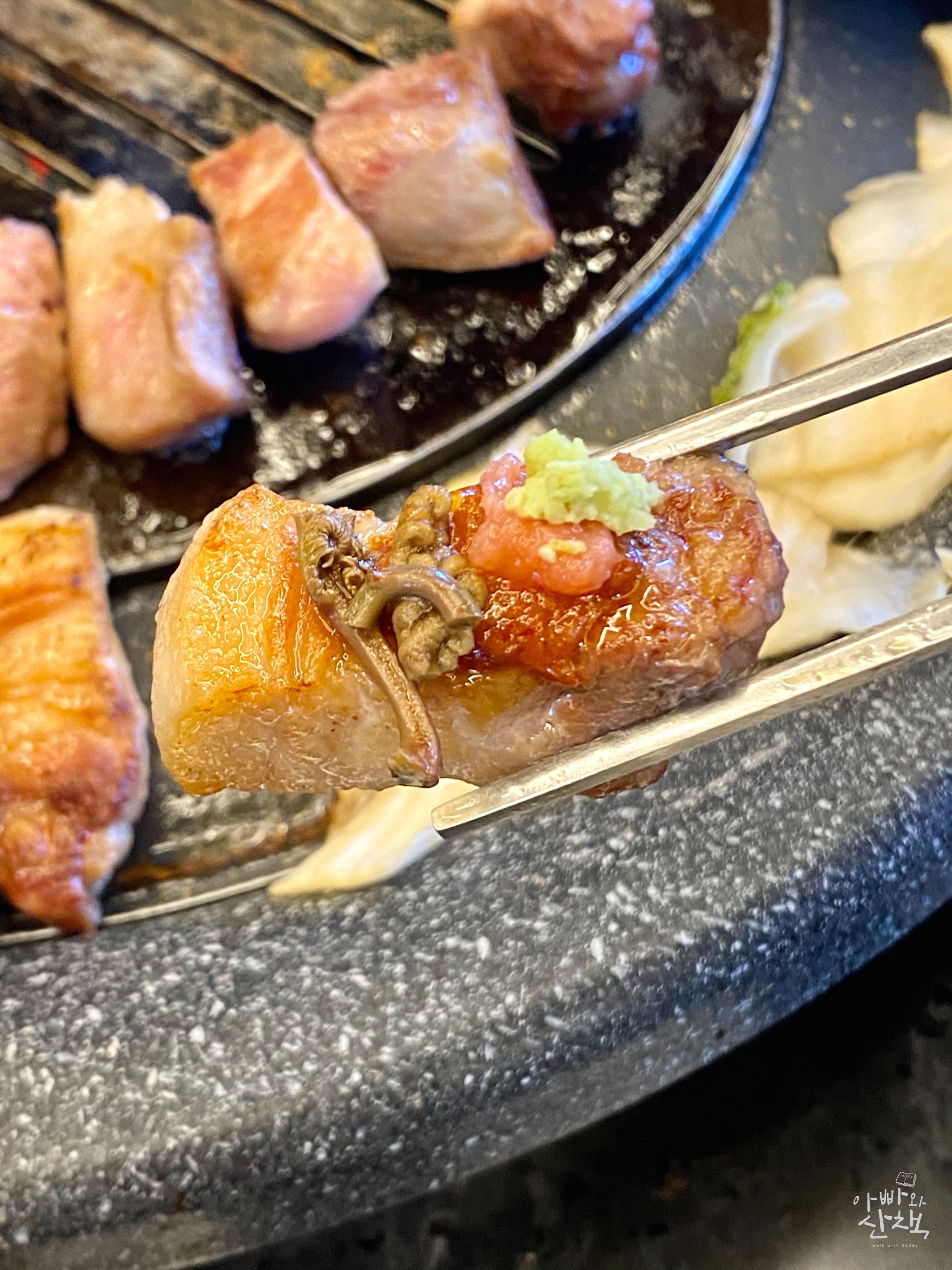 숙성도의 고기는 부드러우면서도 탄탄한 육질과 풍부한 감칠맛에  갈치속젓, 명란젓을 얹어 먹는 재미까지 더해져 불판을 순식간에 비우게 됩니다. 기본 반찬으로 제공되는 직접 담근 고사리, 유채나물 등 장아찌와 김치찌개도 별미입니다.