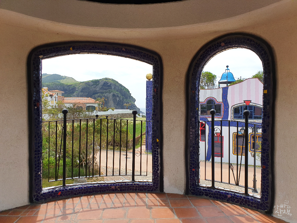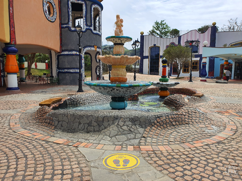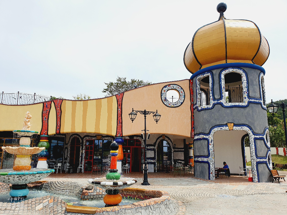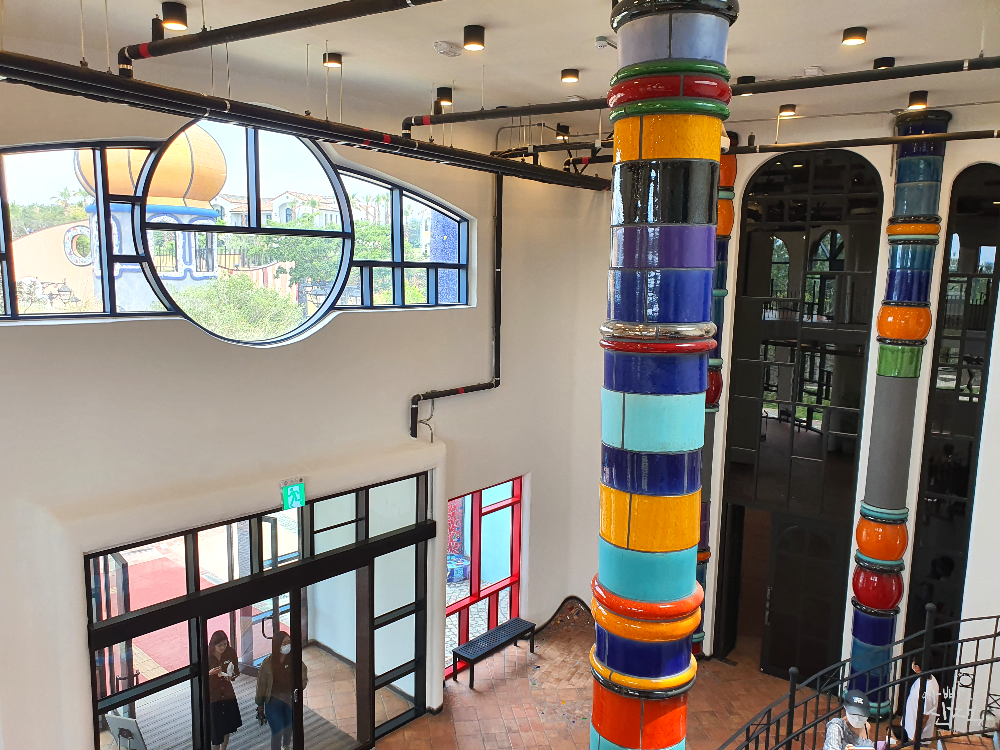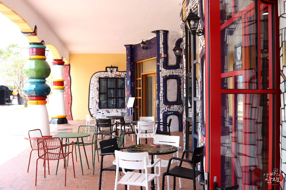 각각의 건물에는 우도 미술관, 훈데르트바서 전시관, 굿즈 숍, 유럽풍 카페 레겐탁이 세계적인 건축가의 독특한 건축 특징과 어우러져 흥미로운 볼거리를 제공하고 있습니다. 양파돔으로 불리는 첨탑과 원색으로 장식된 건물들이 낯설게 느껴지는 여행자라면 입장 후 훈데르트바서 전시관부터 방문해 보길 추천합니다. ‘자연과의 조화’를 중요시한 훈데르트바서의 건축 철학을 소개하는 짧은 영상을 보고 나면 화려한 모습의 창과 벽, 기둥 그리고 직선이 없는 건물들의 의미가 한결 쉽고, 감동적으로 다가옵니다.