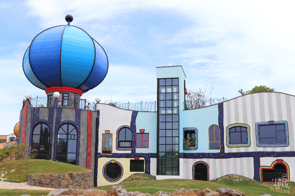 우도 천진항 인근에 위치한 훈데르트바서 파크는 오스트리아를 대표하는 화가이자 건축가, 환경운동가였던 프리덴슈라이히 훈데르트바서의 건축 철학을 바탕으로 지어진 리조트 겸 문화 예술 공간입니다.