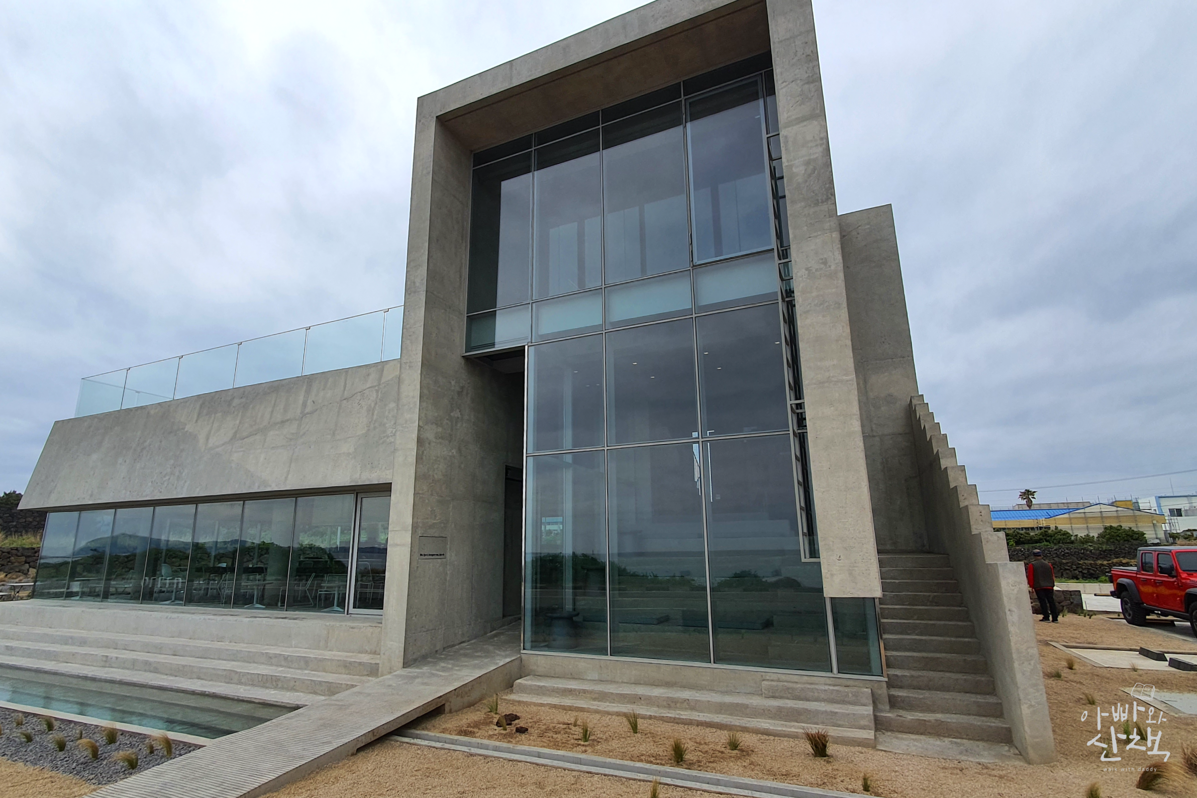 삼면이 유리로 되어 있는 1층의 바다 전망과 함께 루프탑에서는 우도, 성산 바다 그리고 지미봉의 모습이 시원스럽게 펼쳐져 제주 여행의 여유로움을 즐기기에 좋습니다. 멋진 전망만으로도 쉬어가기 좋은 곳이지만, 유리를 겹겹이 겹쳐 만든 3톤 무게의 긴 테이블과 루프탑에 있는 아코디언을 닮은 의자, 유럽 공원을 연상케 하는 철제 의자 등 특별한 가구와 인테리어를 둘러보는 재미도 놓치기 아쉬운 곳입니다. 특히 눈치 없이는 입구를 찾기 어려운 화장실 문이 주는 재미는 꼭 경험해 보시길 바라며, 차 한 잔의 여유와 함께 미술관 온 듯 둘러보는 시간을 가져보시길 추천합니다.